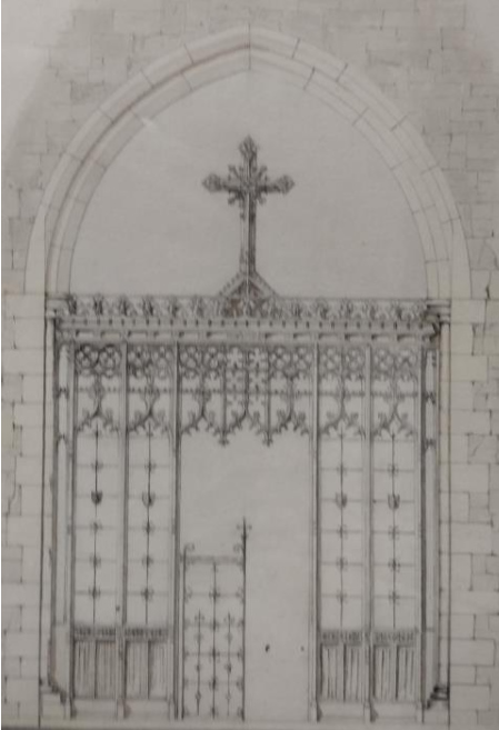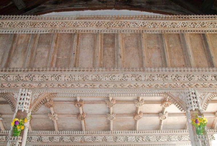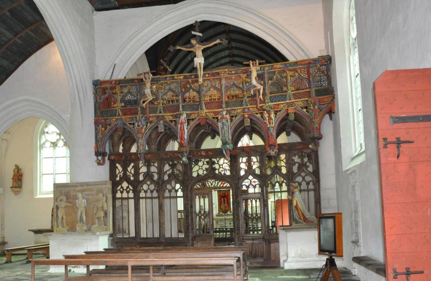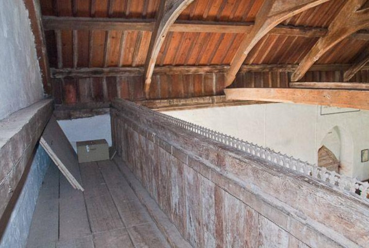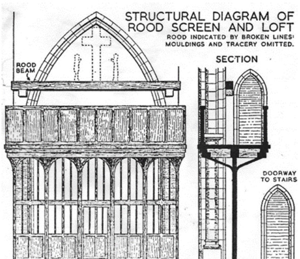 If we look up to where the Nave’s southern wall joins its east wall, we see two oblong openings, one above the other. These were doorways (probably accessed by ladder) leading to the rood loft and beam that existed until their removal in 1558. Geddington had both a ‘Stooping Rood’ and a ‘High Rood’ above. We don’t know exactly what the Geddington Rood looked like, but the diagram below gives a general indication.