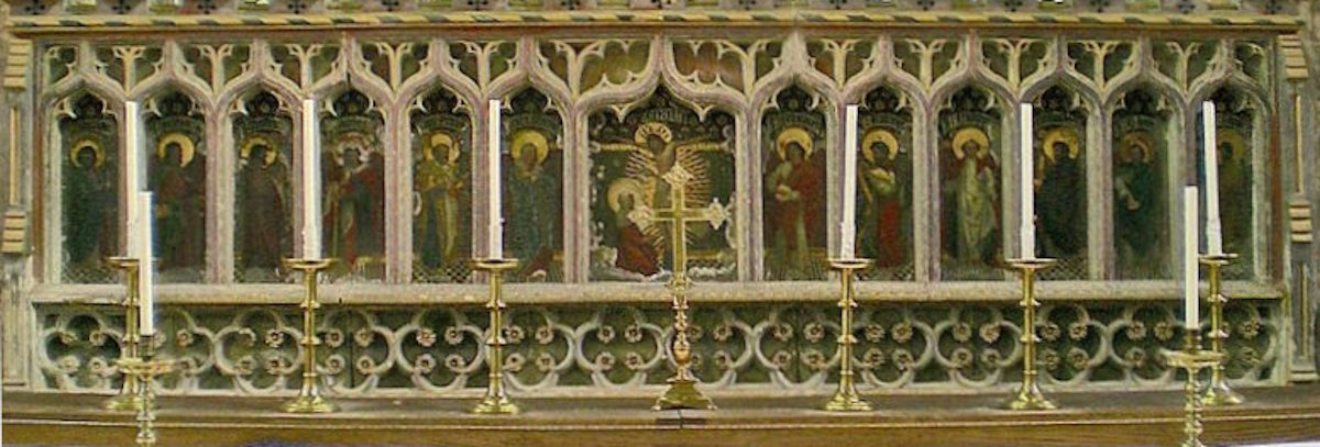 The 1,000 year old church of St Mary Magdalene in Geddington features an early 14th century reredos. This is the screen behind the High Altar symbolising the Last Supper before Christ was crucified. It is a carved and decorated stone structure with 13 niches that today contain finely painted pictures of the crucified Christ and the 12 apostles, painted c. 1890 by Sir Ninian Comper, a famous architect who worked extensively at Westminster Abbey and who designed and built St. Mary’s, Wellingborough.
