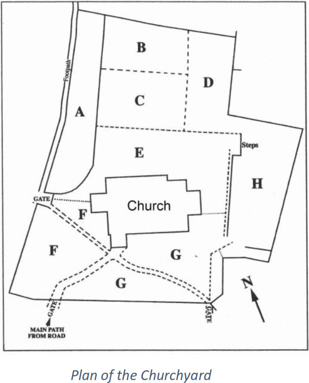 The churchyard is large and divided into sections by paths. In the Plan (right), the sections are designated A to H. The older stones are mainly found to the south of the church, whilst the newer sections extend back some distance to the north side of the church and the newest section of all (H) is to the east.