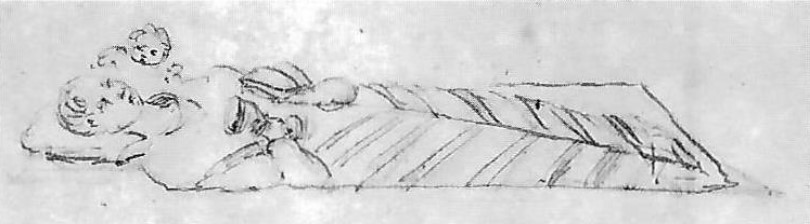 Sir Henry Dryden also recorded this monument in 1843. By this time, the lowermost part of the effigy seems to have been lost, and the facial features and cherub appear less distinct. By 1899, a drawing by Christopher Markham shows it much as we see today, with the eyes only just discernible.