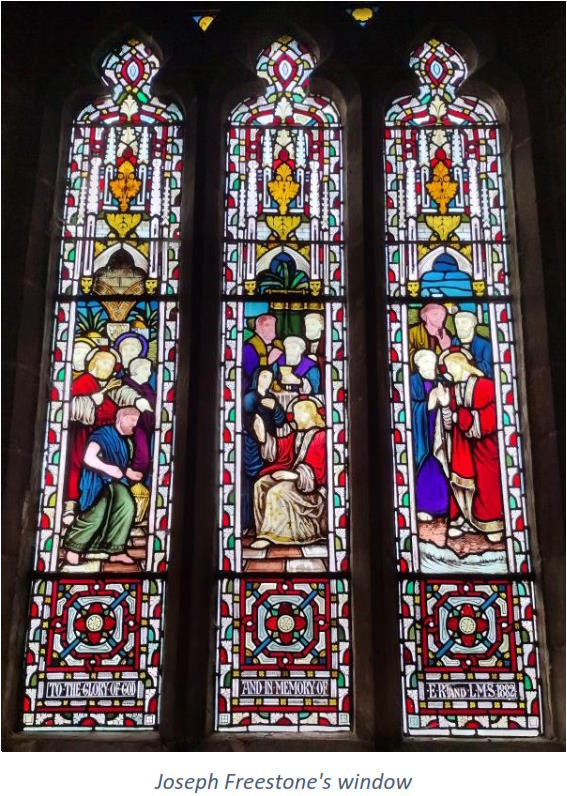 The glass in the 15th Century window (above) next to the Tresham Screen is the work of Joseph Freestone (1848-1929), who lived at 1-3 West Street in Geddington. Joseph was a talented man who, as well as being an artist in stained glass, was a member of the Royal Academy. He is buried in the churchyard with his nephew, Conrad William Henry Groves.
