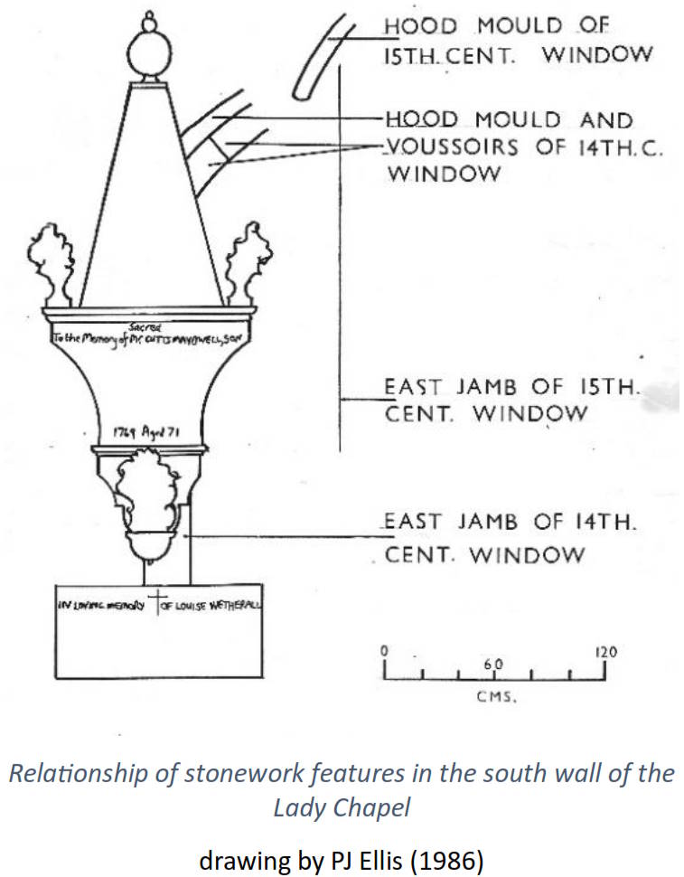The internal stonework of the south wall of the chapel is complex, showing signs of several alterations down the centuries. The chapel once had two 14th Century windows, but little remains of either.