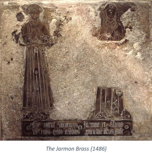 The brass is the work of a Coventry workshop run by a mason and marbler named Robert Crosse. The Will of Henry German (Jarmon) is dated 1486, so the brass must have been made in that year or shortly afterwards. This memorial was moved from its original position in the North Aisle in 1906.