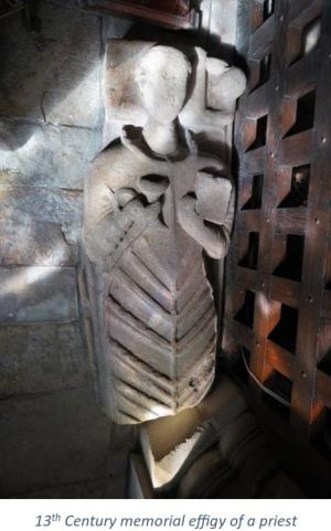 On the floor to the left of the Altar is the stone effigy of a recumbent priest which is thought to be 13th or 14th Century in date. Lying west to east, he has a tonsure and long neck, a chalice in his right hand, a bible or Missal in his left, and a paten (for the bread) under his right arm. He is vested for Mass, with a chasuble over his alb. Next to his head is a worn-down cherub. The stone shows signs of having been trimmed in the past, and a piece appears to have been lost from the eastern end.