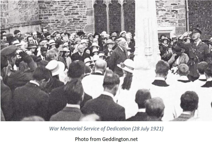 Built by Mr. Patrick of Geddington, construction took a month and, on 28 July 1921, the memorial was unveiled by Major Wetherall of Northampton, whose family had close connections with Geddington. Seventy years later, all 170 of those who served in the Great War were commemorated in Melvyn Hopkins’ book Geddington, A Village at War.